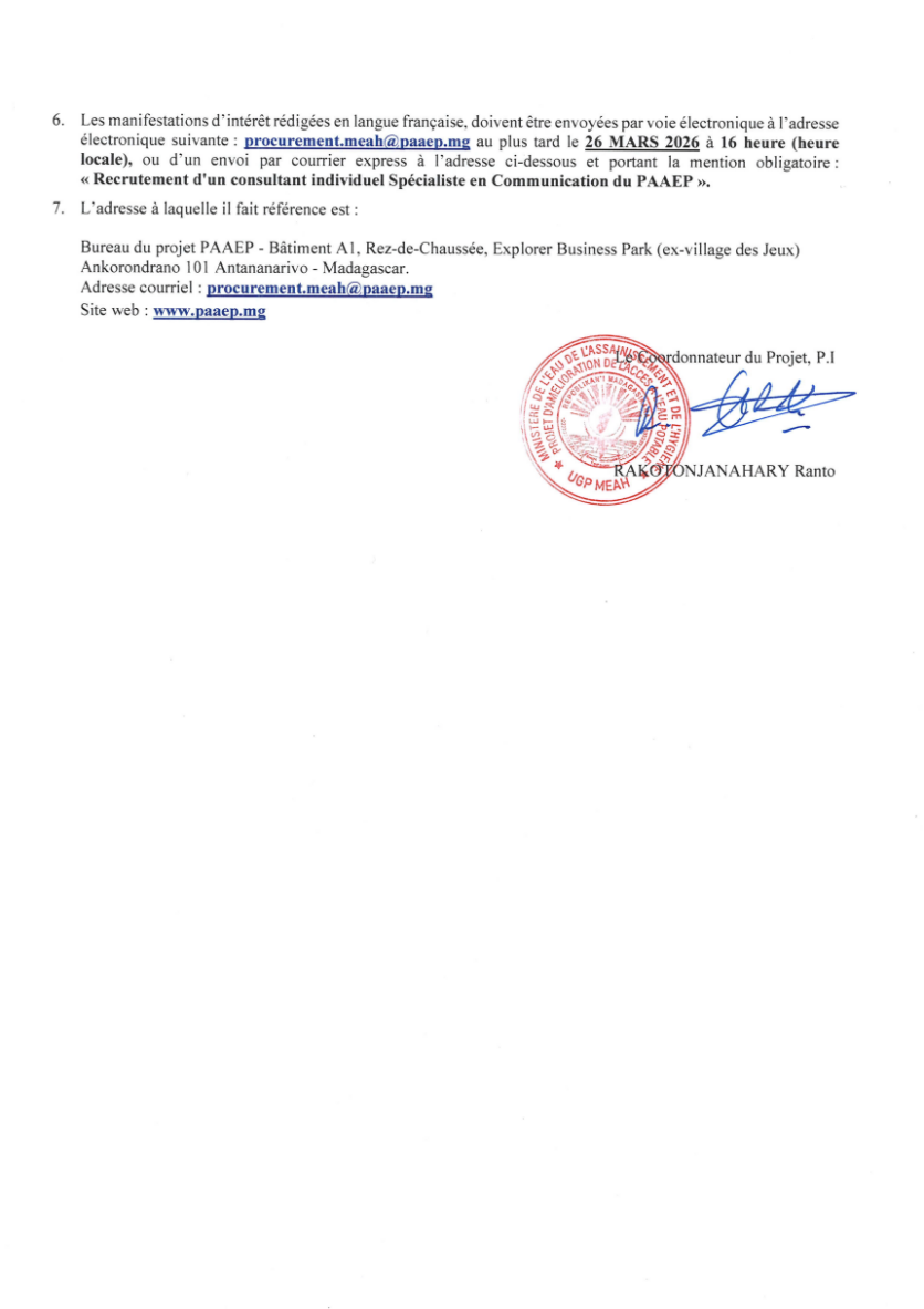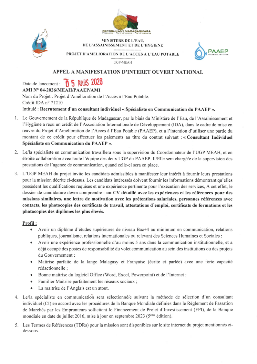 APPEL A MANIFESTATION D'INTERET OUVERT NATIONAL N° 04-2026/MEAH/PAAEP/AMI pour RECRUTEMENT D'UN CONSULTANT INDIVIDUEL « SPECIALISTE EN COMMUNICATION DU PAAEP »
