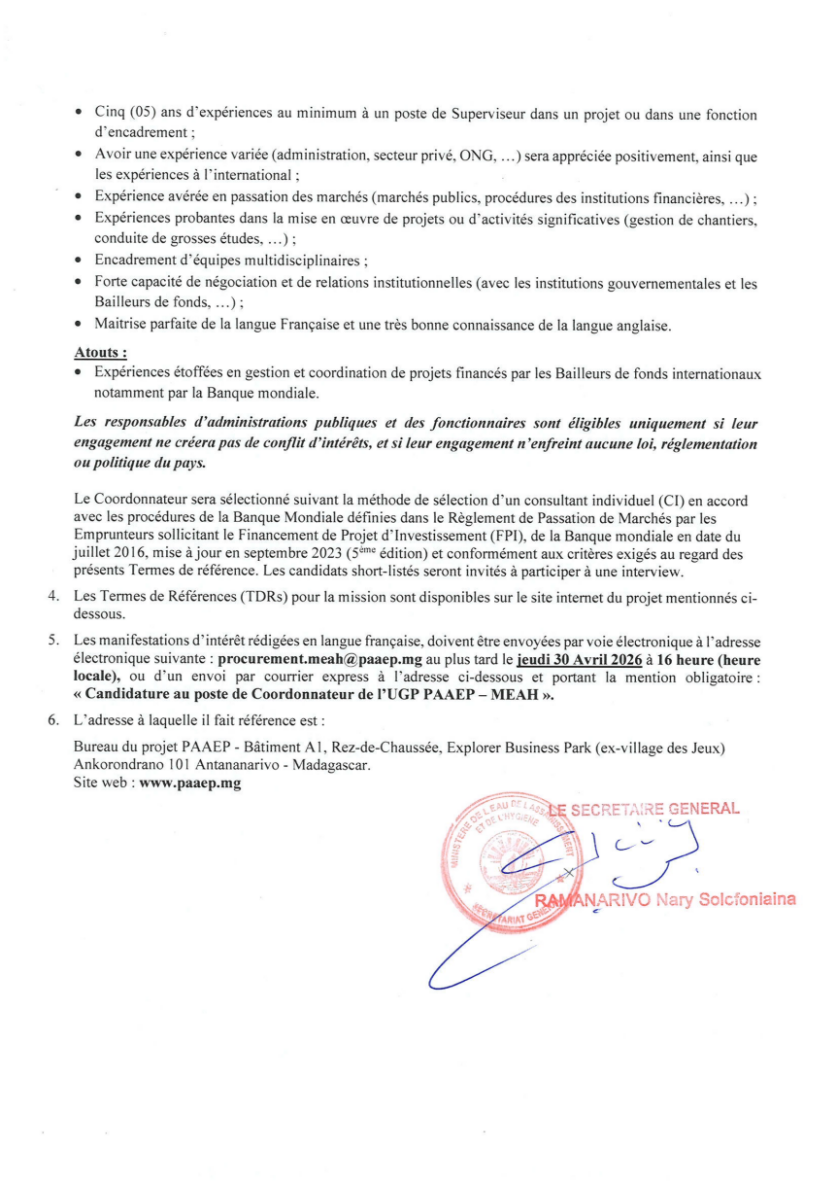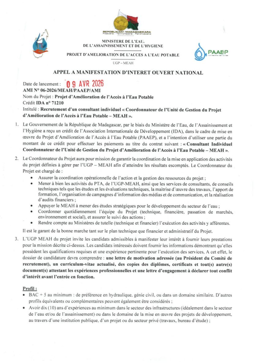 APPEL A MANIFESTATION OUVERT NATIONAL N° 06-2026/MEAH/PAAEP/AMI pour RECRUTEMENT D’UN CONSULTANT INDIVIDUEL "COORDONNATEUR DE L'UNITE DE GESTION DU PROJET D'AMELIORATION DE L'ACCES A L'EAU POTABLE - MEAH"