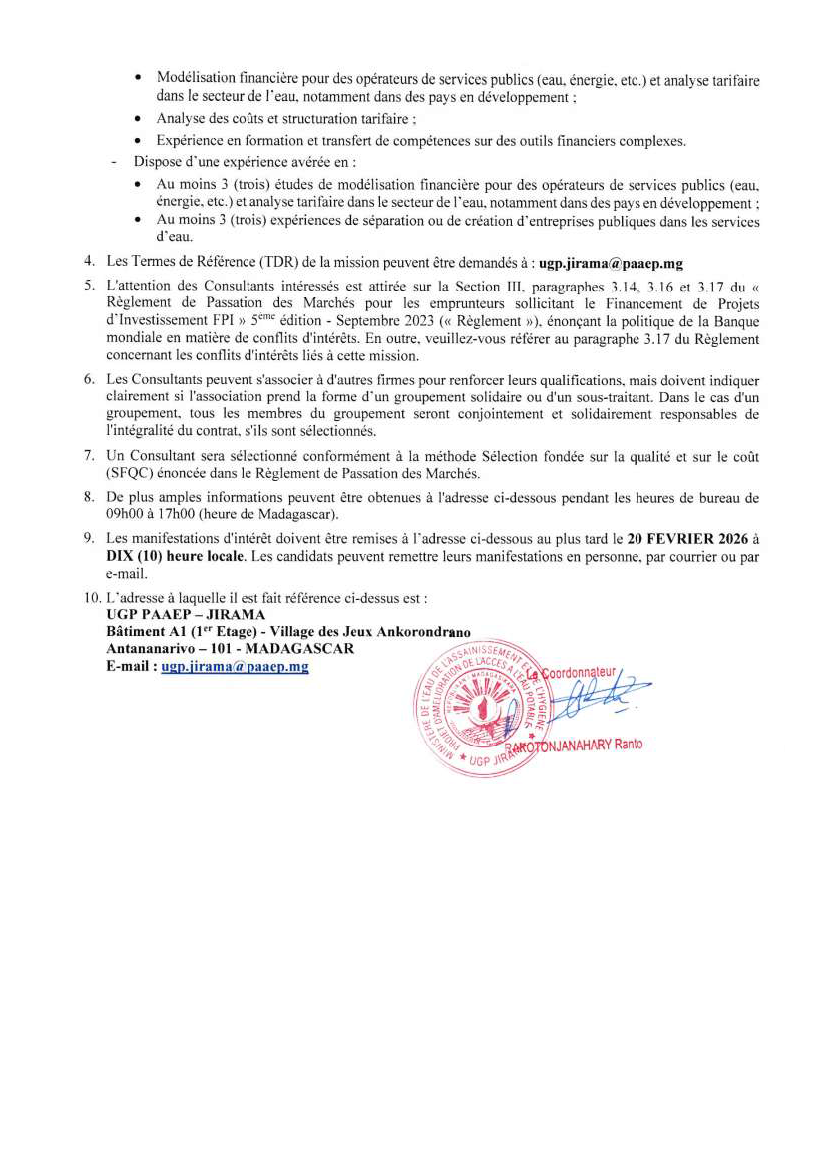 APPEL A MANIFESTATION D'INTERE N° PAAEP – 001/26 – WJIR-C pour ETUDE VISANT A PROMOUVOIR LA SEPARATION DES COMPTES ENTRE LES ACTIVITES "EAU" ET "ELECTRICITE", A ELABORER UN MODELE FINANCIER OPERATIONNEL DE L'ACTIVITE "EAU" AFIN DE SERVIR D'OUTIL D'APPUI AU CYCLE BUDGETAIRE ET COMPTABLE AINSI QU'A LA REVISION DE LA GRILLE TARIFAIRE "EAU" ET A ELABORER UNE FEUILLE POUR LA SEPARATION OPERATIONNELLE ET JURIDIQUE DE LA BRACHE "EAU" DE LA JIRAMA