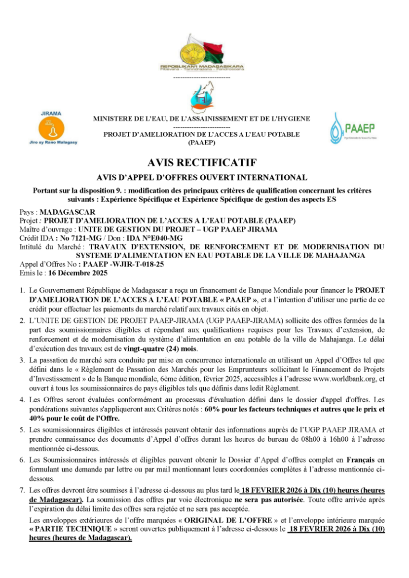 APPEL D'OFFRES OUVERT INTERNATIONAL N°: PAAEP -WJIR-T-018-25 pour TRAVAUX D’EXTENSION, DE RENFORCEMENT ET DE MODERNISATION DU SYSTEME D’ALIMENTATION EN EAU POTABLE DE LA