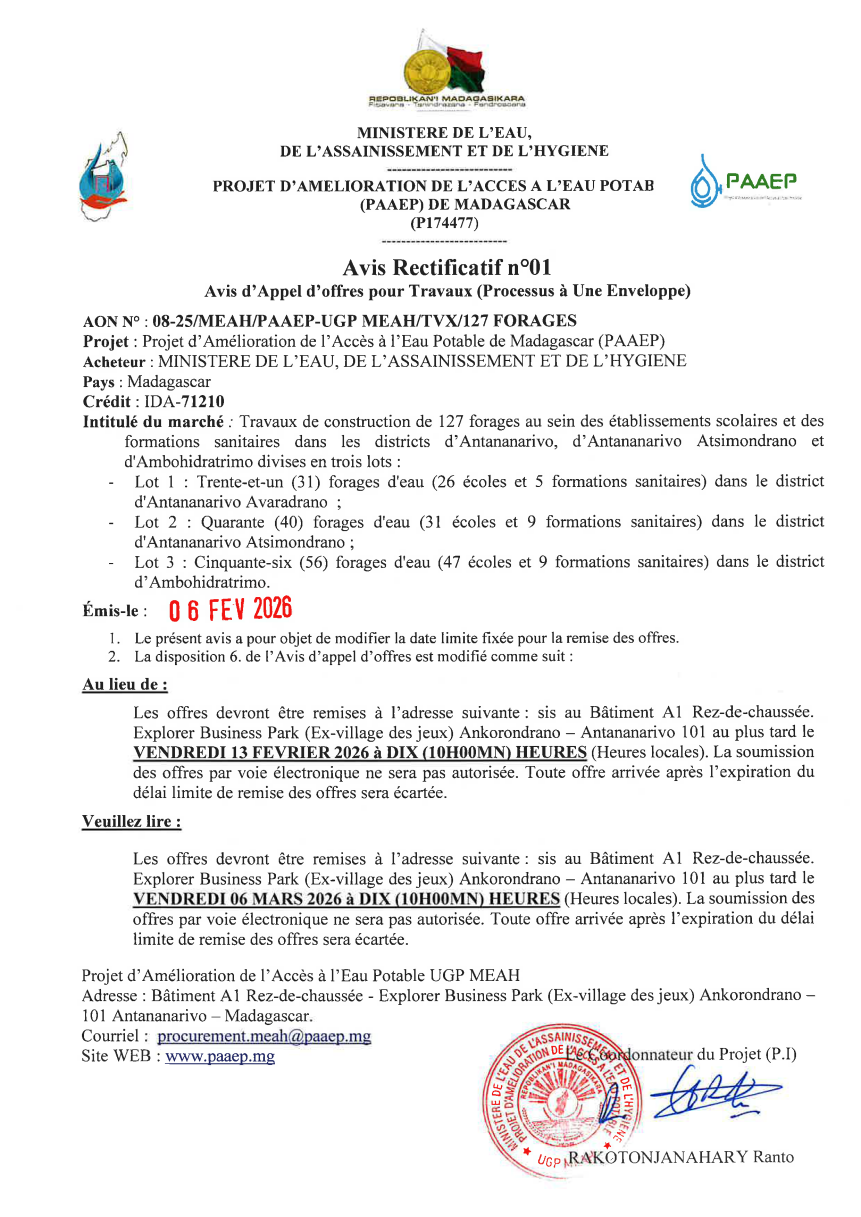 APPEL D'OFFRES OUVERT NATIONAL N°: N° 08-25/MEAH/PAAEP-UGP MEAH/TVX/127 FORAGES pour TRAVAUX DE CONSTRUCTION DE 127 FORAGES AU SEIN DES ETABLISSEMENTS SCOLAIRES ET DES FORMATIONS SANITAIRES DANS LES DISTRICTS D'ANTANANARIVO, D'ANTANANARIVO ATSIMONDRANO ET D'AMBOHIDRATRIMO DIVISES EN TROIS LOTS :