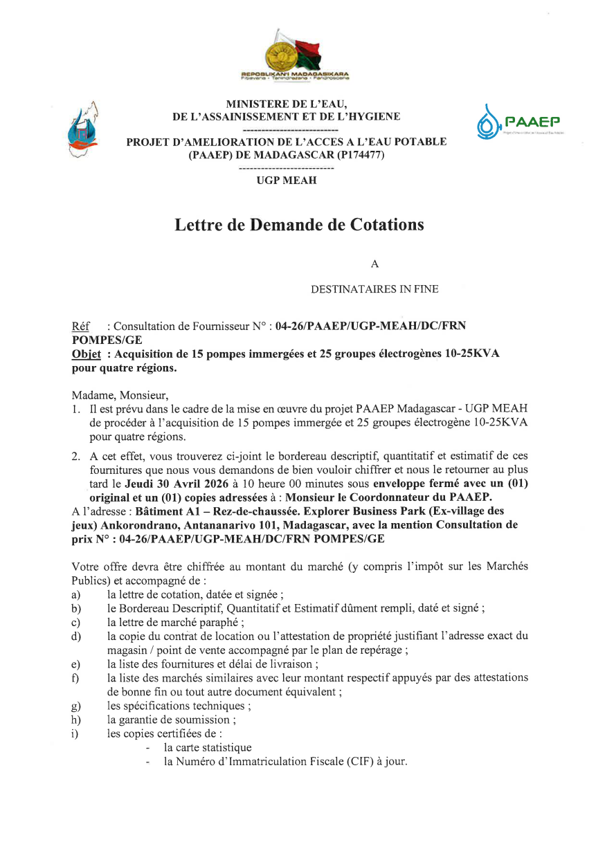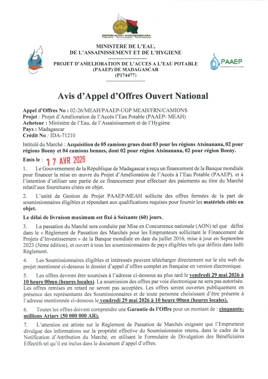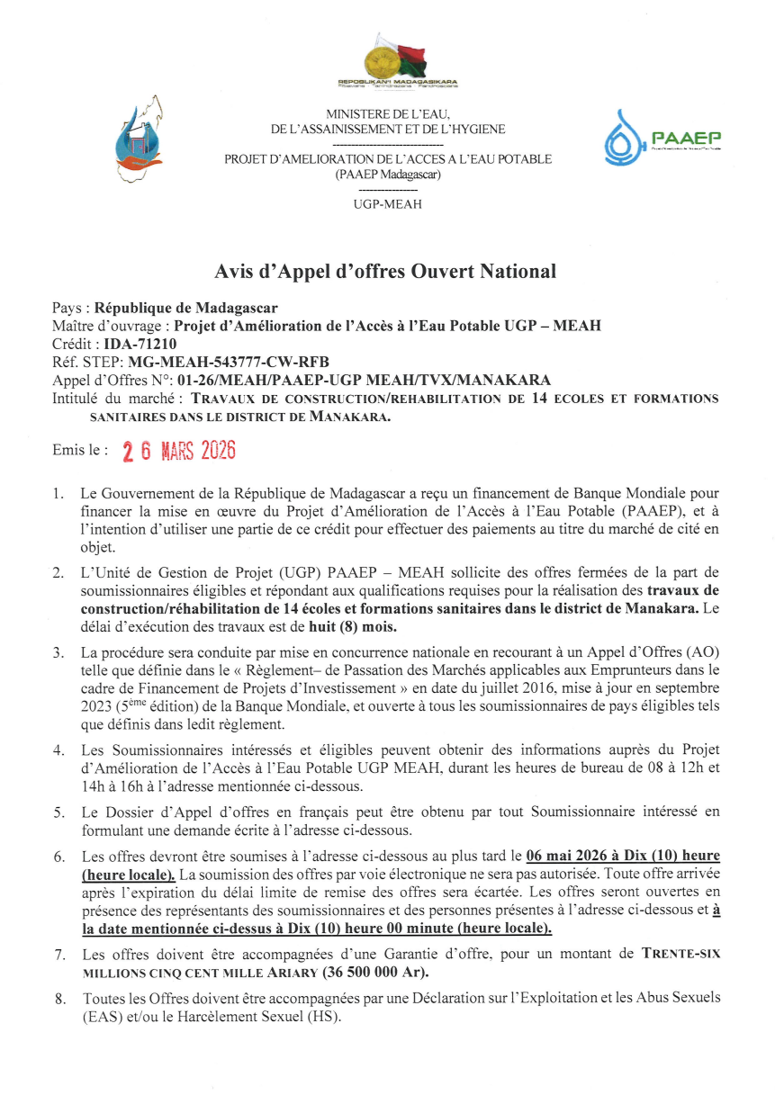 PAAEP - UGP JIRAMA | APPEL D'OFFRES OUVERT INTERNATIONAL N°PAAEP - WJIR-T-006-25
