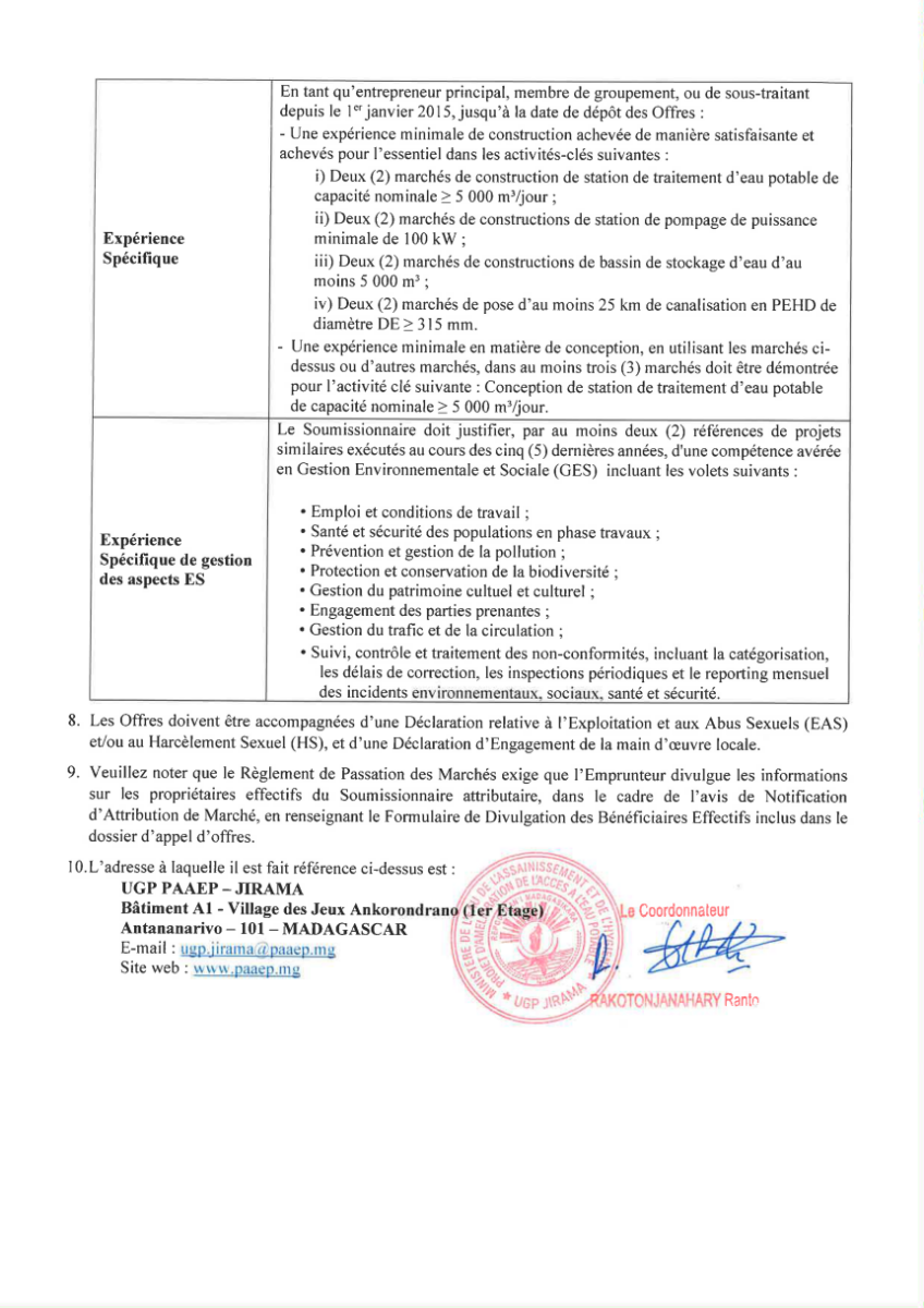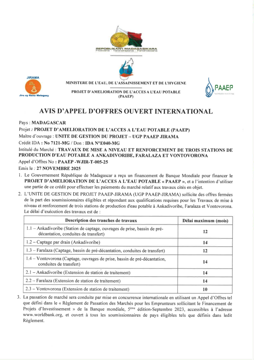 AVIS D'APPEL D'OFFRES OUVERT INTERNATIONAL N° PAAEP-WJIR-T-005-25. OBJET : TRAVAUX DE MISE A NIVEAU ET RENFORCEMENT DE TROIS STATIONS DE PRODUCTION D'EAU POTABLE A ANKADIVORIBE, FARALAZA ET VONTOVORONA.